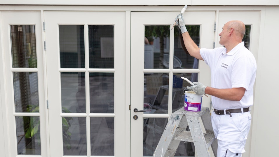 Alex Verbeek heeft sinds een jaar of vier zijn eigen schilderbedrijf. Zijn partner doet voor hem de boekhouding. 'Ik werk gewoon graag met mijn handen. Een mooie oplossing zo!'